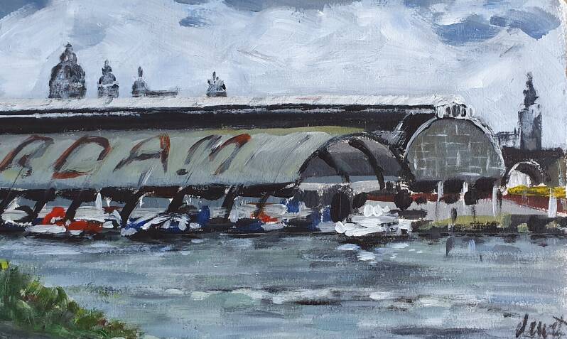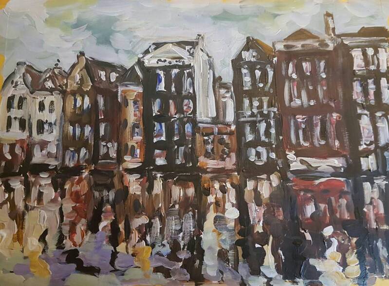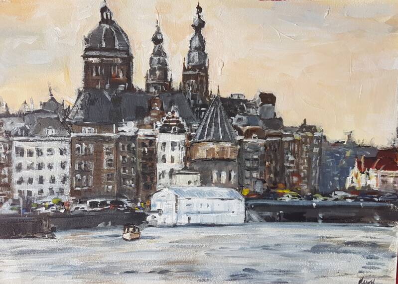 2019 SOLD View on the river Amstel, Amsterdam, acrylic paint on paper/Zicht op de rivier de Amstel, acrylverfop papier, 18x26 cm