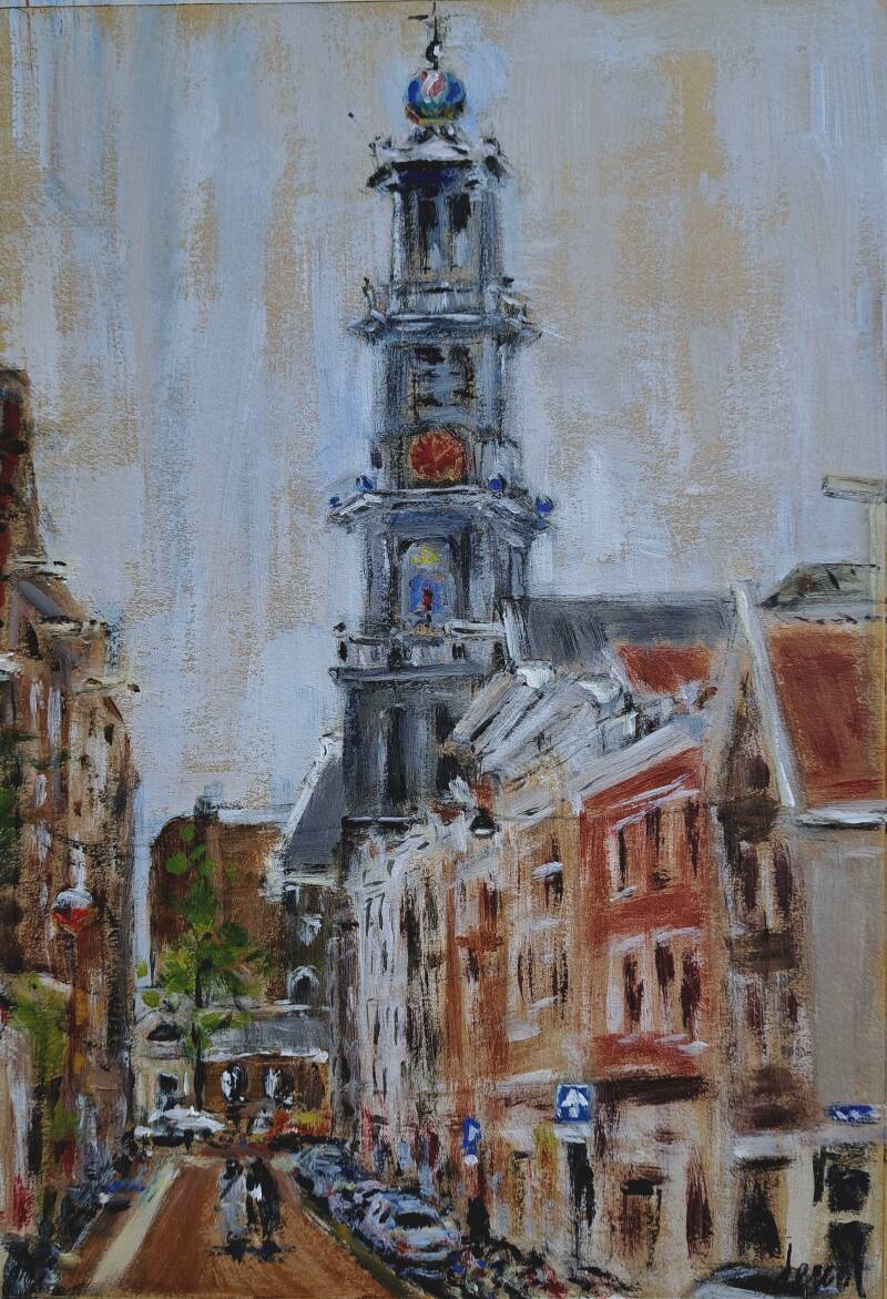 2017 SOLD Westertoren, Amsterdam, acrylic paint on paper/acrylverf op papier, 19x28 cm