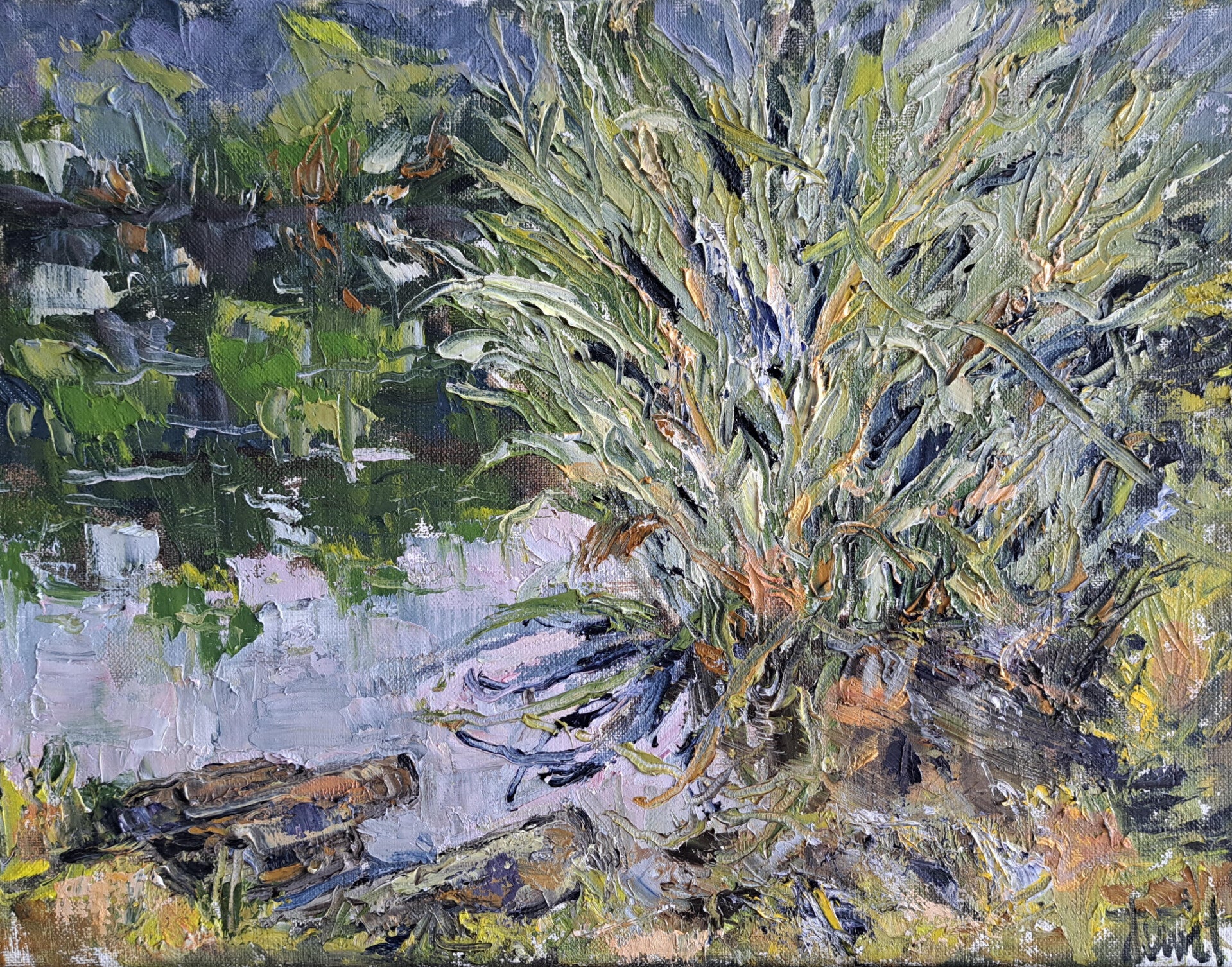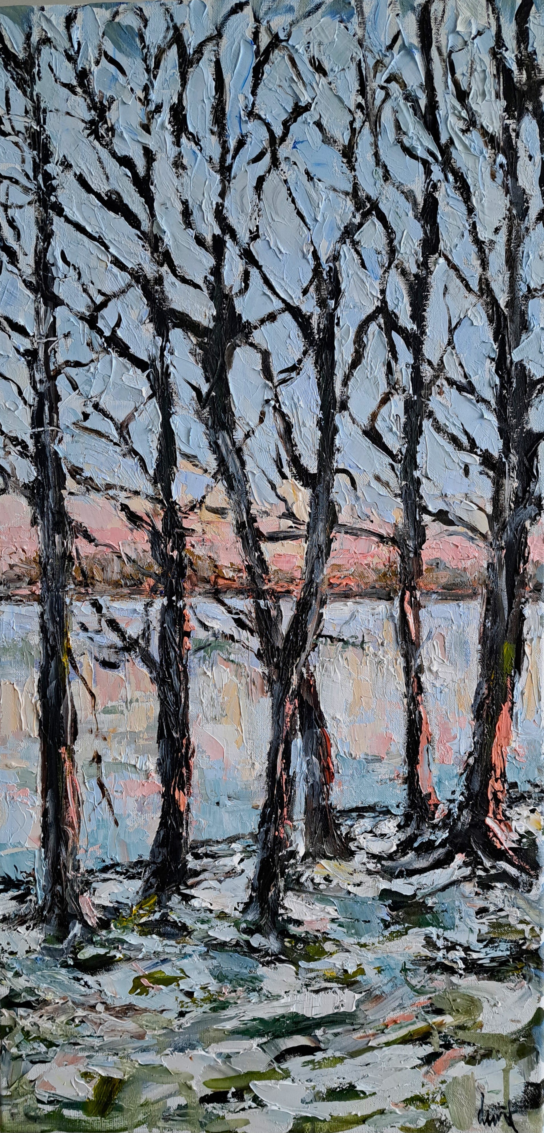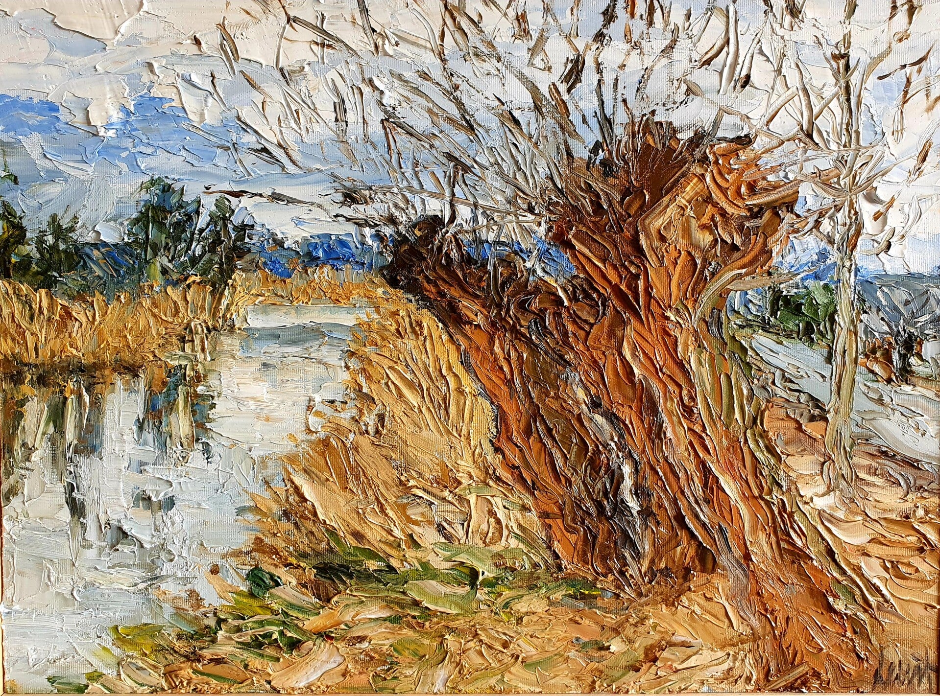 SOLD Pollard willows along the river, oil on panel/Knotwilgen langs de rivier, olie op paneel, 30x40 cm