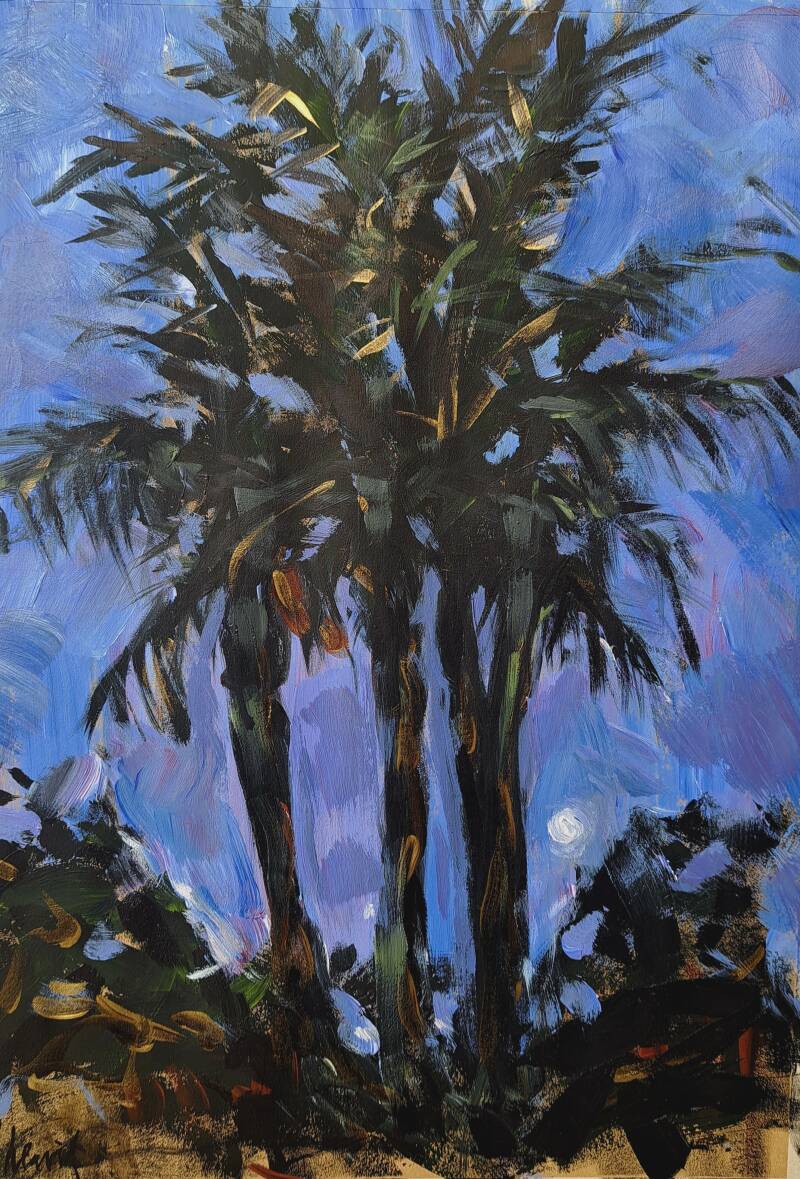 Plam trees at night, acrylic paint on paper/ Plambomen in de nacht, acryl op papier, 39x29 cm