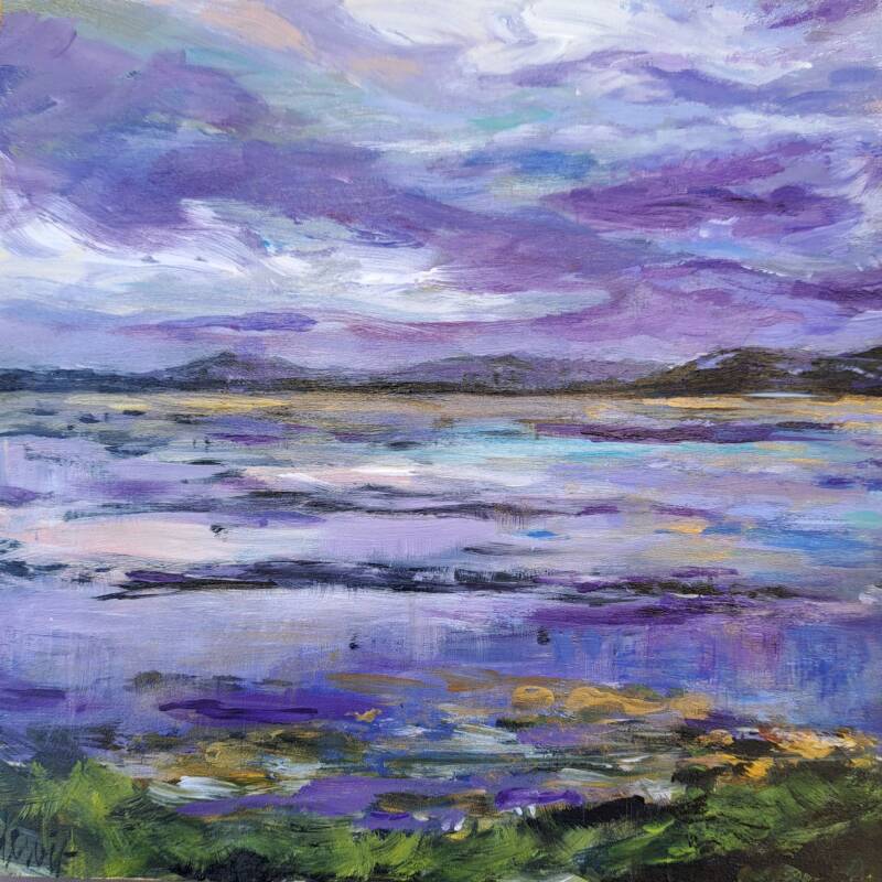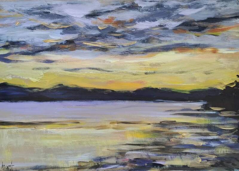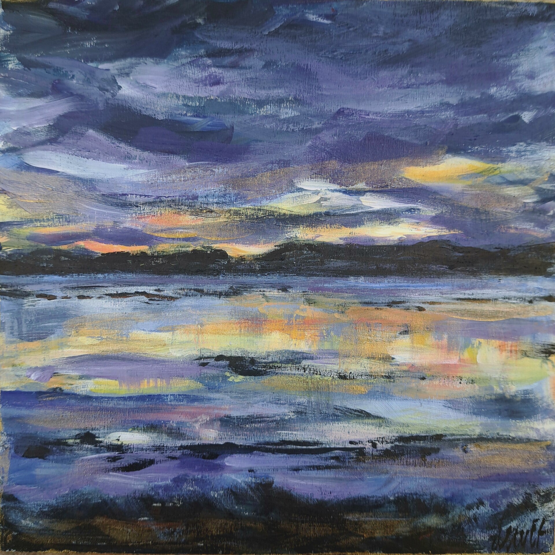 It is getting dark/Het wordt donker - Purple tones in the lake/Paarse tinten in het meer - Almost dark/Bijna donker- SOLD Golden sunset/Gouden zonsondergang, acrylic paint on wood 20x20