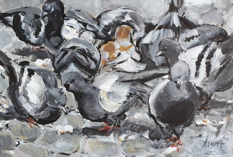 2019 Pigeons on the square, acrylic paint on paper/ Duiven op het plein, acrylverf op papier, 23,5x34,5 cm