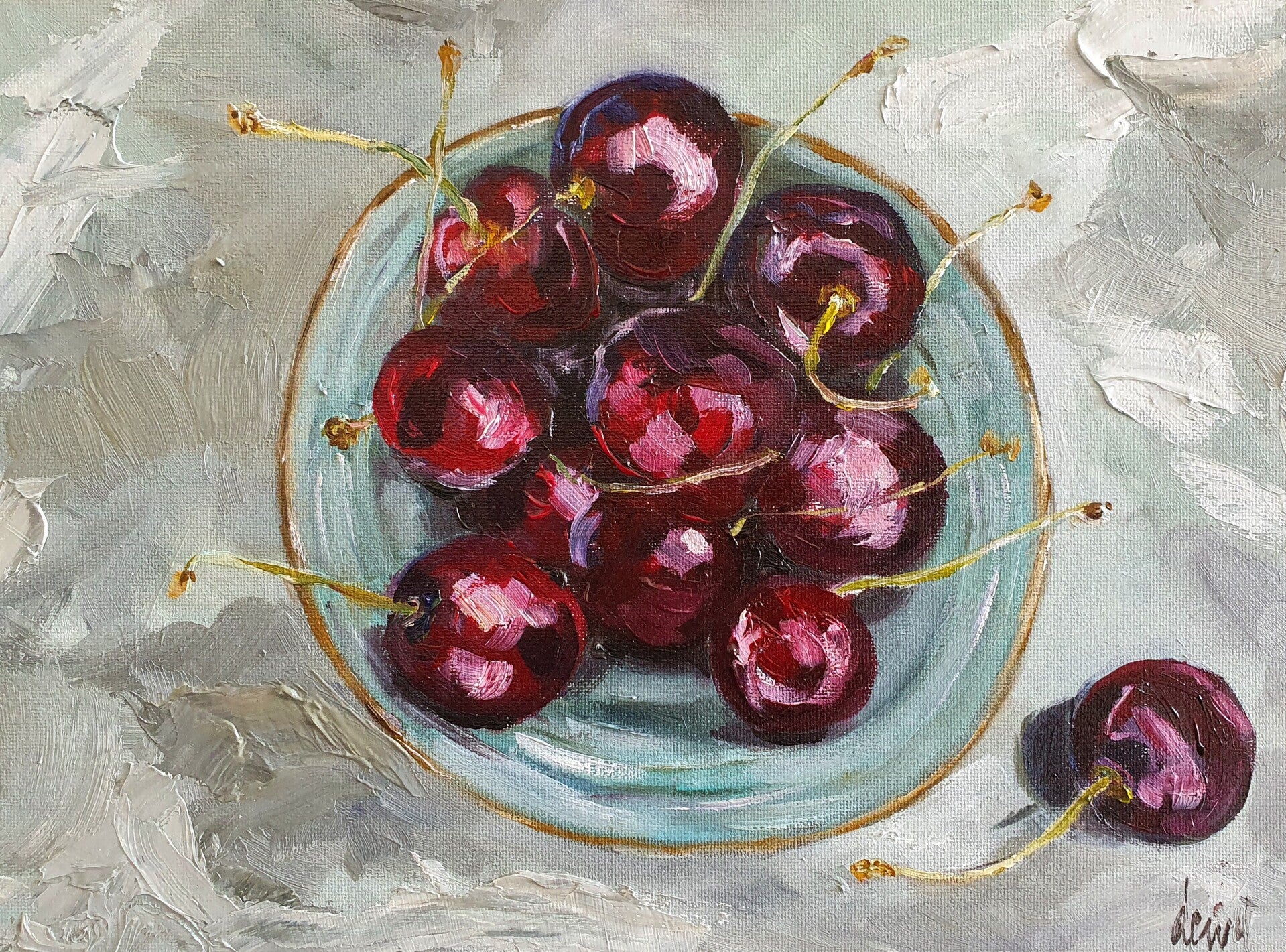 SOLD Bowl with cherrys, oil on panel/ Schaaltje met kersen, olie op paneel, 20x30 cm