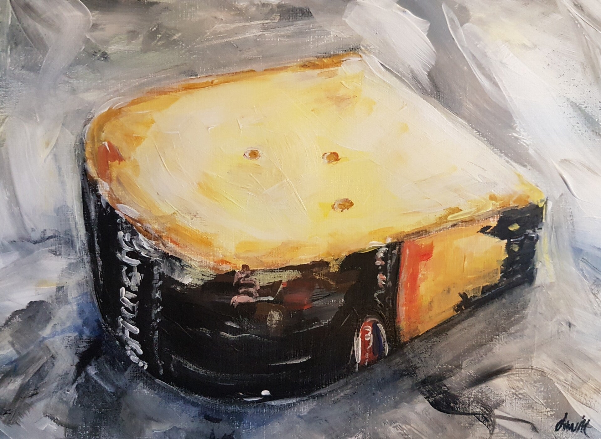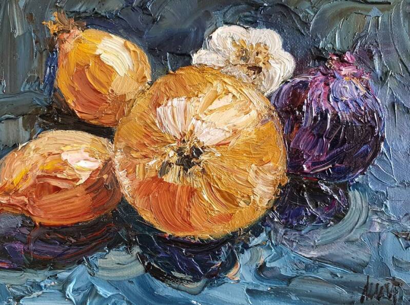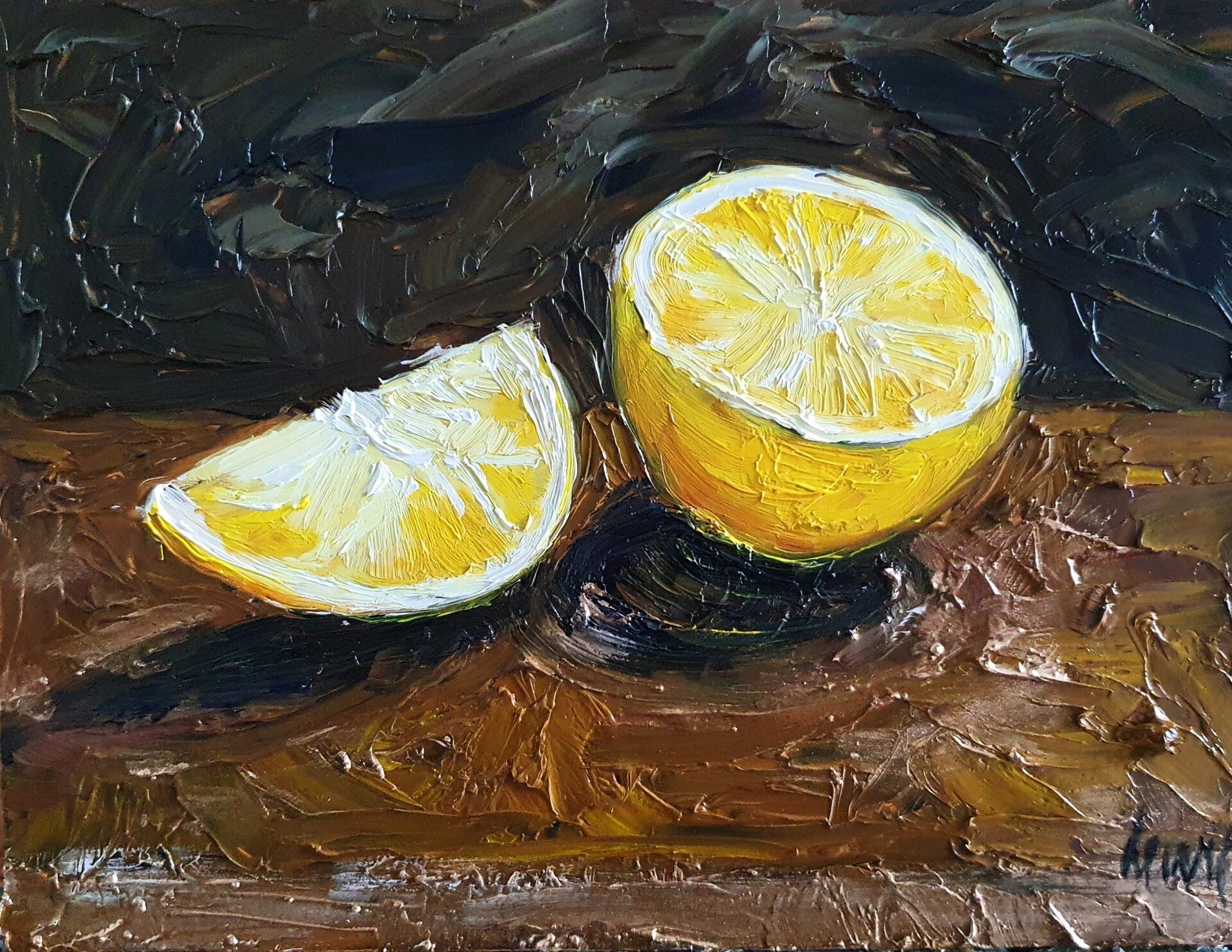 2018 SOLD Orange with knife, acrylic paint on paper/ Sinaasappel met mes, acrylverf op papier, 20x24,5 cm