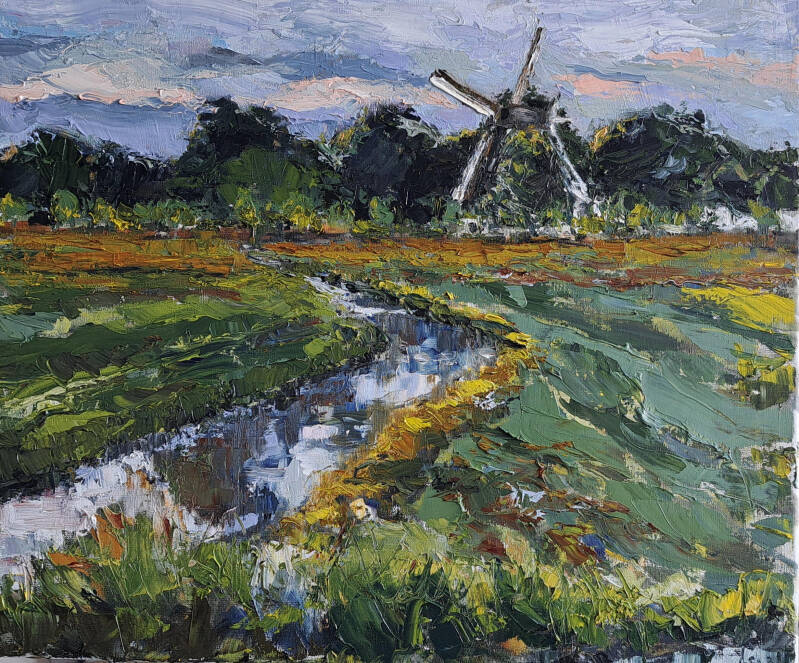 SOLD Windmill, acrylic paint on wood/ Molen, acrylverf op hout, 30x40 cm , First prize plein-air painting day/ Eerste prijs plein-air schilderdag